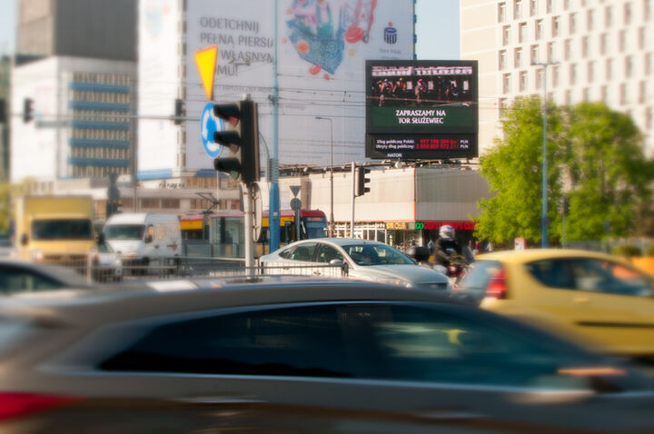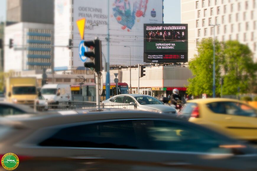 Reklama wyścigów konnych na ekranie w centrum Warszawy (fot. T.Celmer)